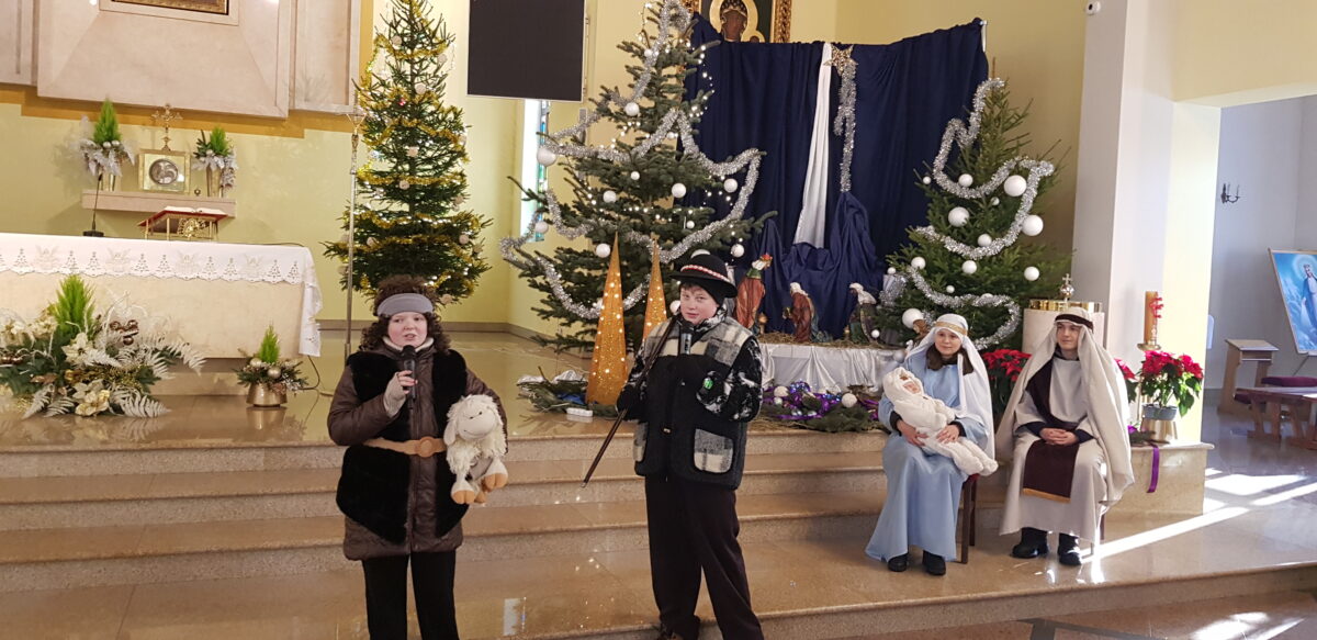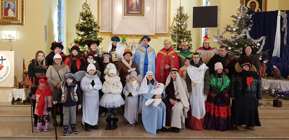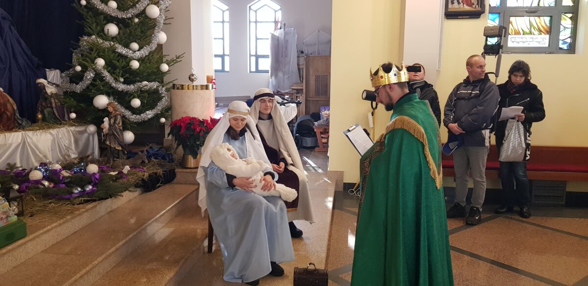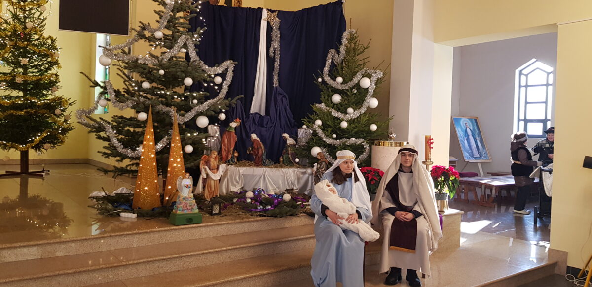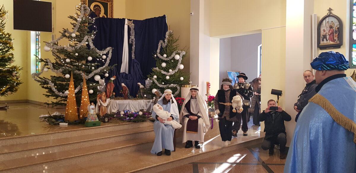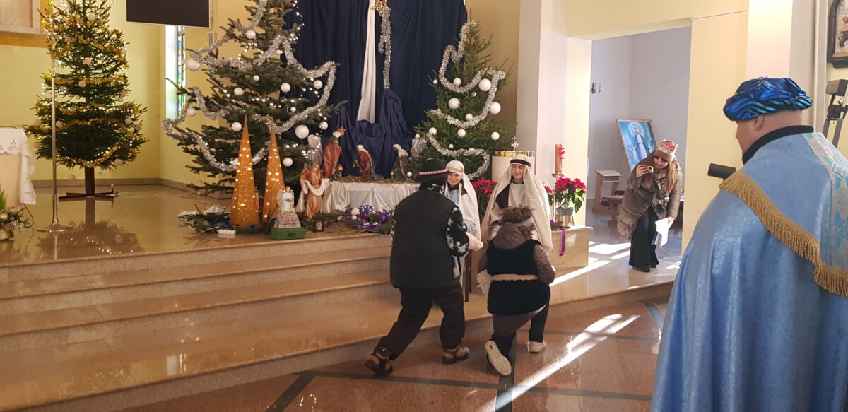 Po dojściu do Pieścirogów, Orszak przeszedł ulicami: Wrzosową, Storczykową, Różaną, Parkową i Kolejową do Kościoła przed wejściem do świątyni obejrzeliśmy scenki biblijne przygotowane przez p. Alę z dziećmi (walka dobra ze złem) oraz WTZ ze Świeszewa (na dworze Heroda oraz w Gospodzie. Już w świątynie dzieci pod kierownictwem p. Ali przedstawiły scenkę pokłon pasterzy.