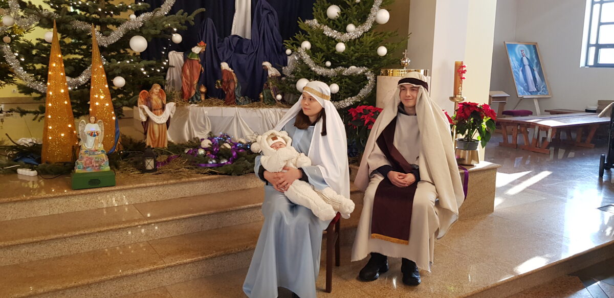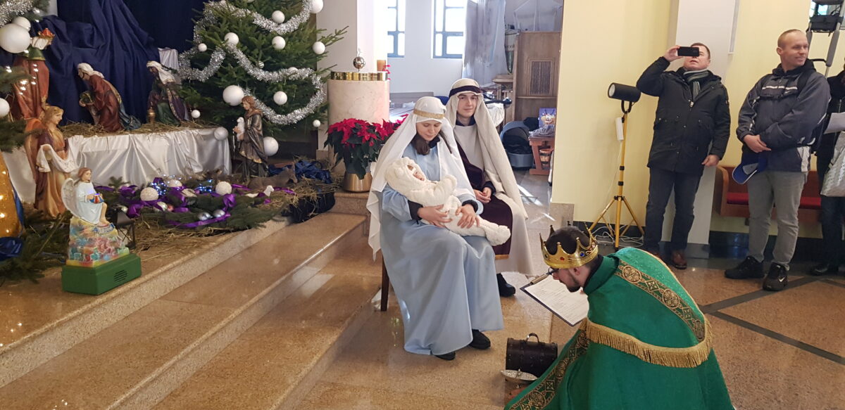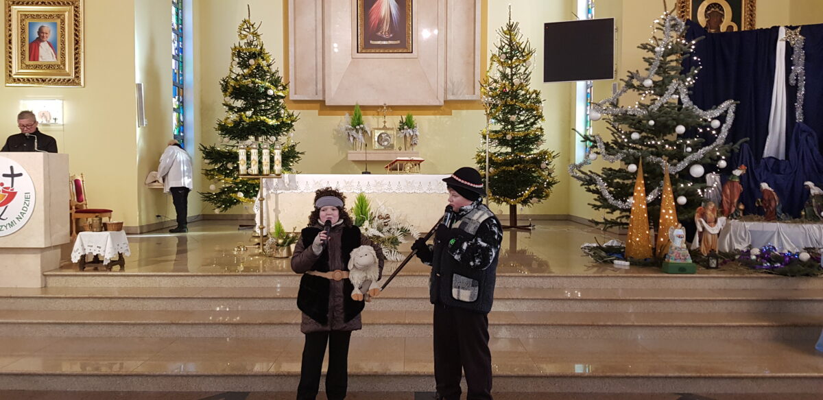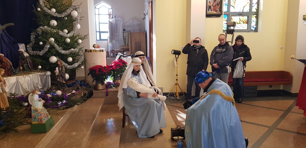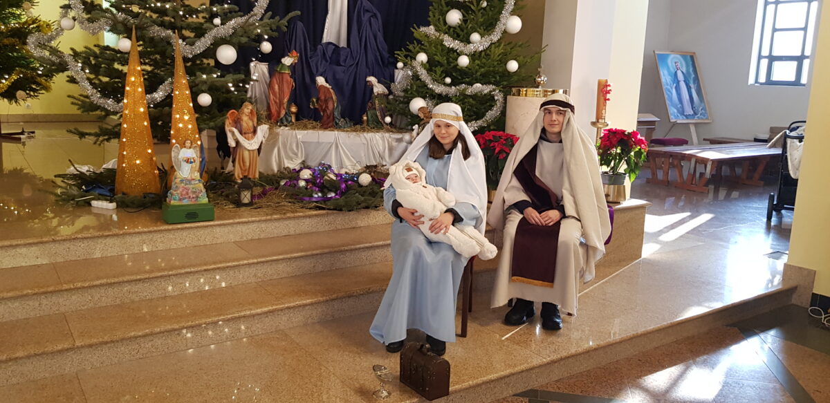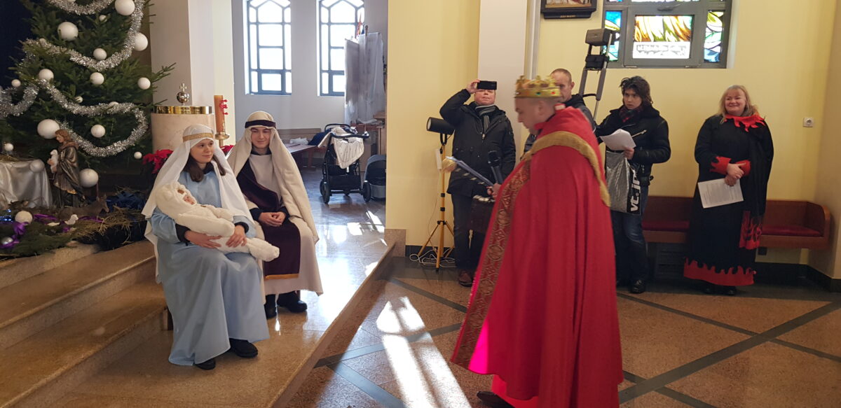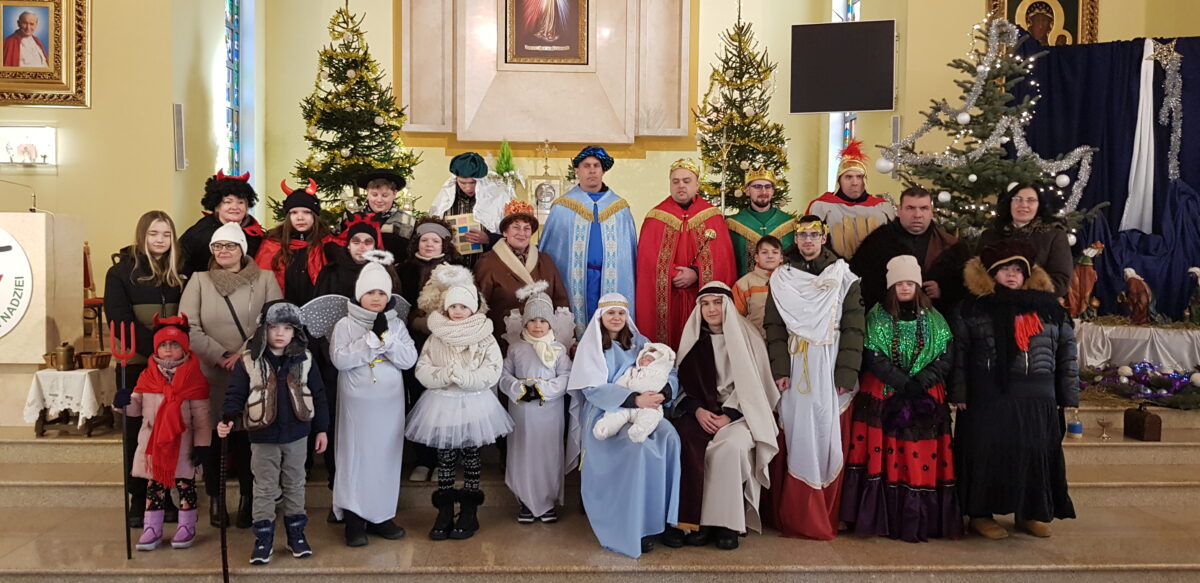 Po dojściu do Pieścirogów, Orszak przeszedł ulicami: Wrzosową, Storczykową, Różaną, Parkową i Kolejową do Kościoła przed wejściem do świątyni obejrzeliśmy scenki biblijne przygotowane przez p. Alę z dziećmi (walka dobra ze złem) oraz WTZ ze Świeszewa (na dworze Heroda oraz w Gospodzie. Już w świątynie dzieci pod kierownictwem p. Ali przedstawiły scenkę pokłon pasterzy.
