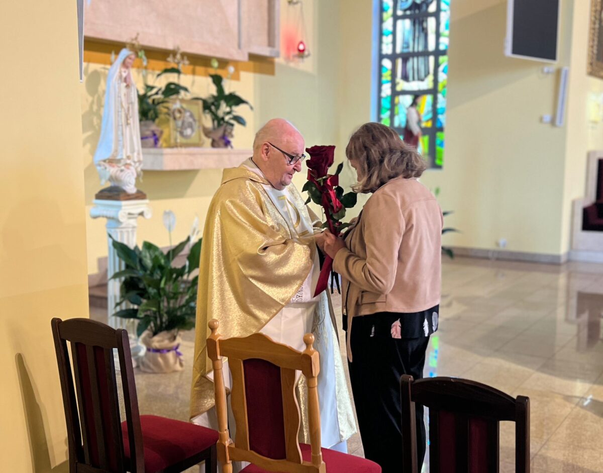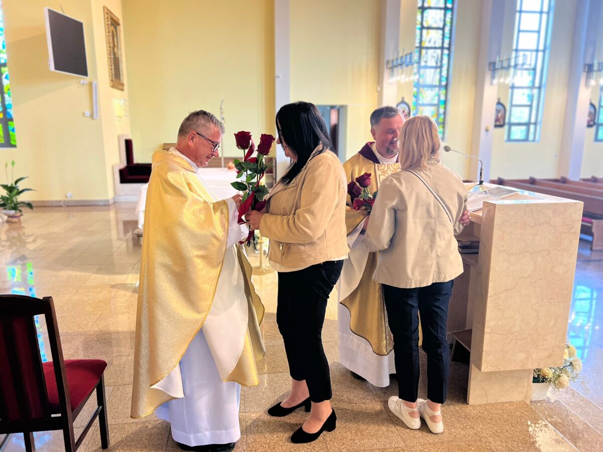 Podczas Mszy Świętej przedstawicielki wspólnot parafialnych złożyły kapłanom serdeczne życzenia – zarówno z okazji dzisiejszej uroczystości, jak i z okazji rocznic święceń kapłańskich, które w ostatnim czasie obchodzili.