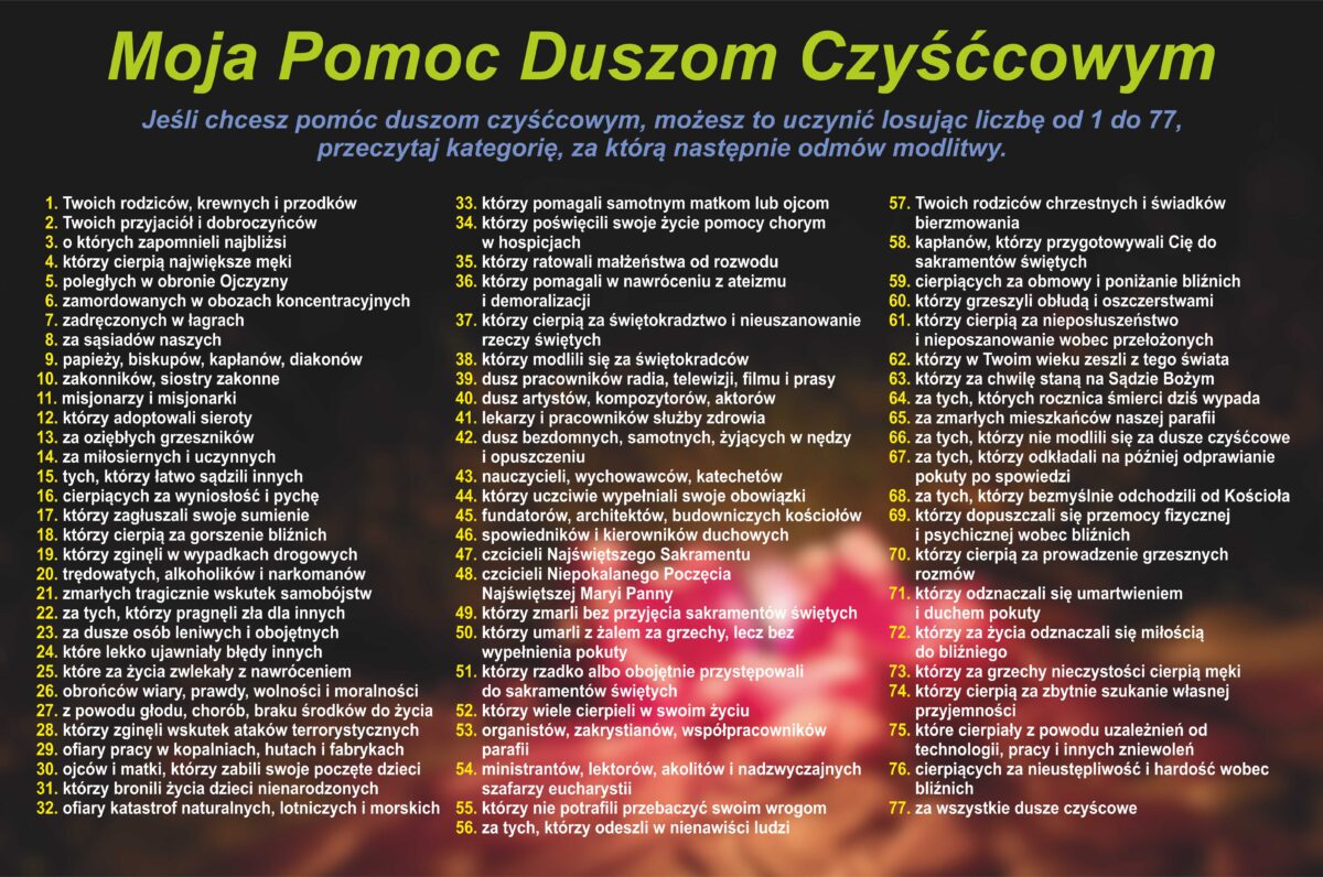 28 sierpnia, 2025W kruchcie pojawiła się nowa tablica zachęcająca do modlitwy za dusze w czyśćcu cierpiące. To inicjatywa Apostolatu dusz w czyśćcu cierpiących. Każdy, kto chce się pomodlić za dusze czyśćcowe, może wyjąć z pierwszego pudełeczka numerek, odczytać intencję i pomodlić się dowolną modlitwą – dłuższą lub krótszą, (może to być różaniec, koronka do Bożego Miłosierdzia, litania, może być nawet tylko 1 zdrowaśka. Ważne, by płynęła z czystego serca i była wsparciem dla tych, którzy oczekują Bożego miłosierdzia i wejścia w bramy Królestwa niebieskiego. Wylosowany numerek przekładamy do drugiego pudełeczka. Możemy modlitwę ofiarować jeden raz i następnego dnia znów wylosować numerek, lub możemy w tej intencji modlić się np. dwa dni, tydzień, czy nawet dłużej. To nasz dar dla konkretnej grupy dusz czyśćcowych.