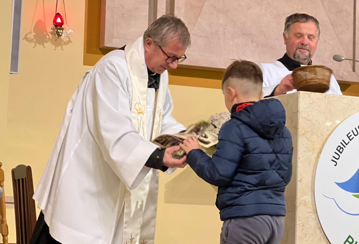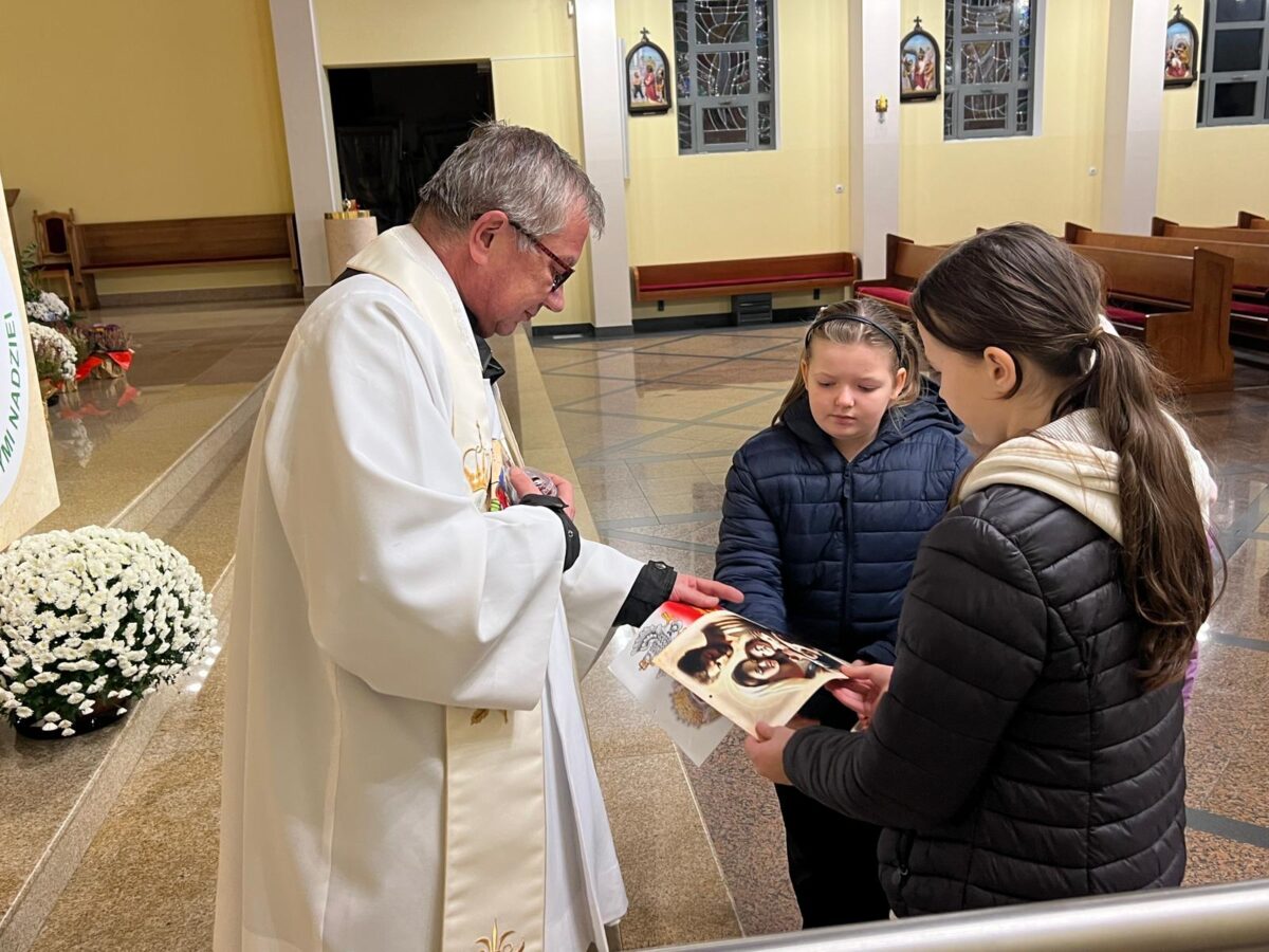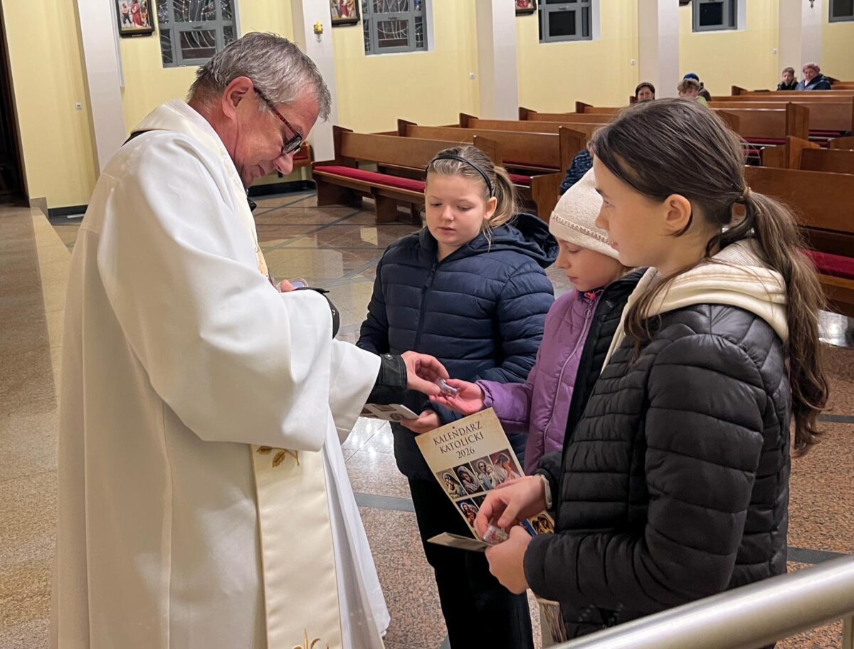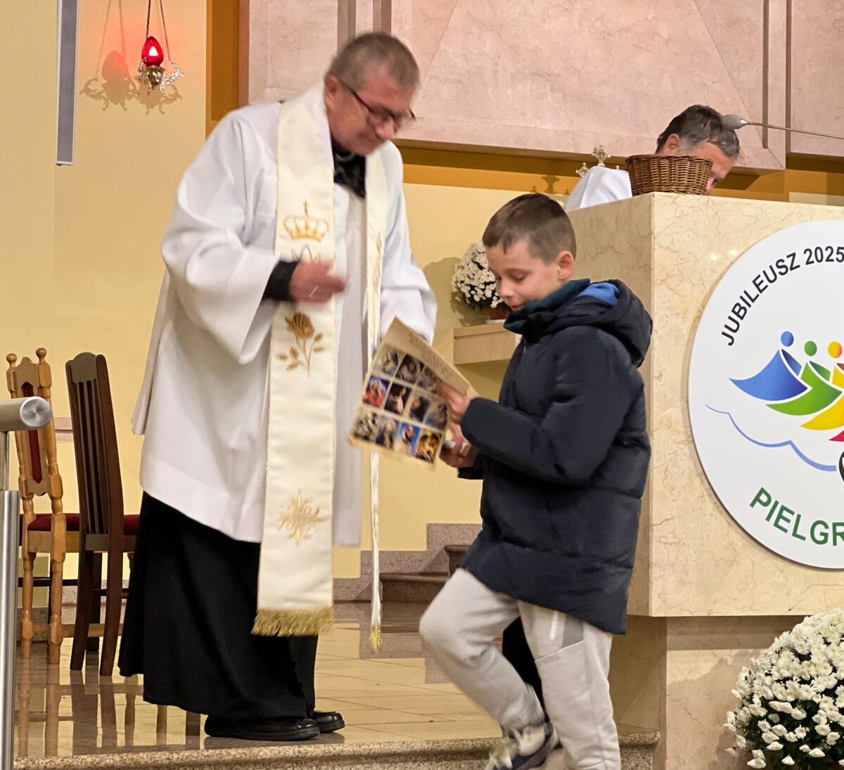 Ks. Proboszcz nagrodził również wszystkie pozostałe dzieci drobnymi upominkami. Cała 13-stka otrzymała także kalendarze ścienne na rok 2026 i po… czekoladzie.